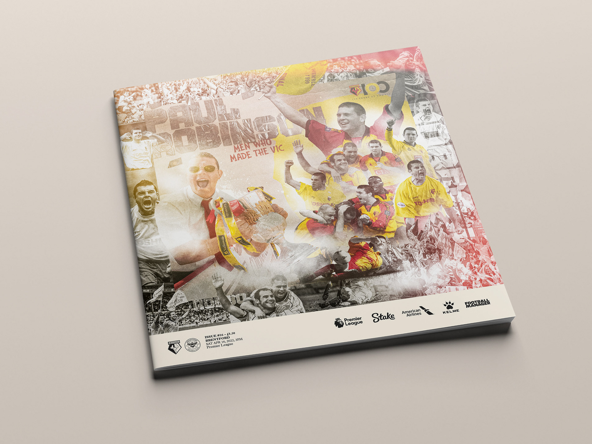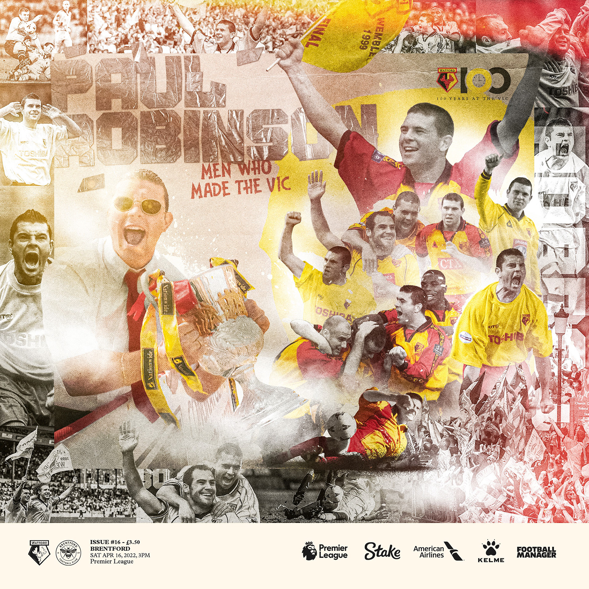 Programme cover for Watford v Brentford on Apr 16, 2022, celebrating Paul Robinson's contributions to Watford Football Club as part of the club's ongoing acknowledgement of 100 Years at Vicarage Road.