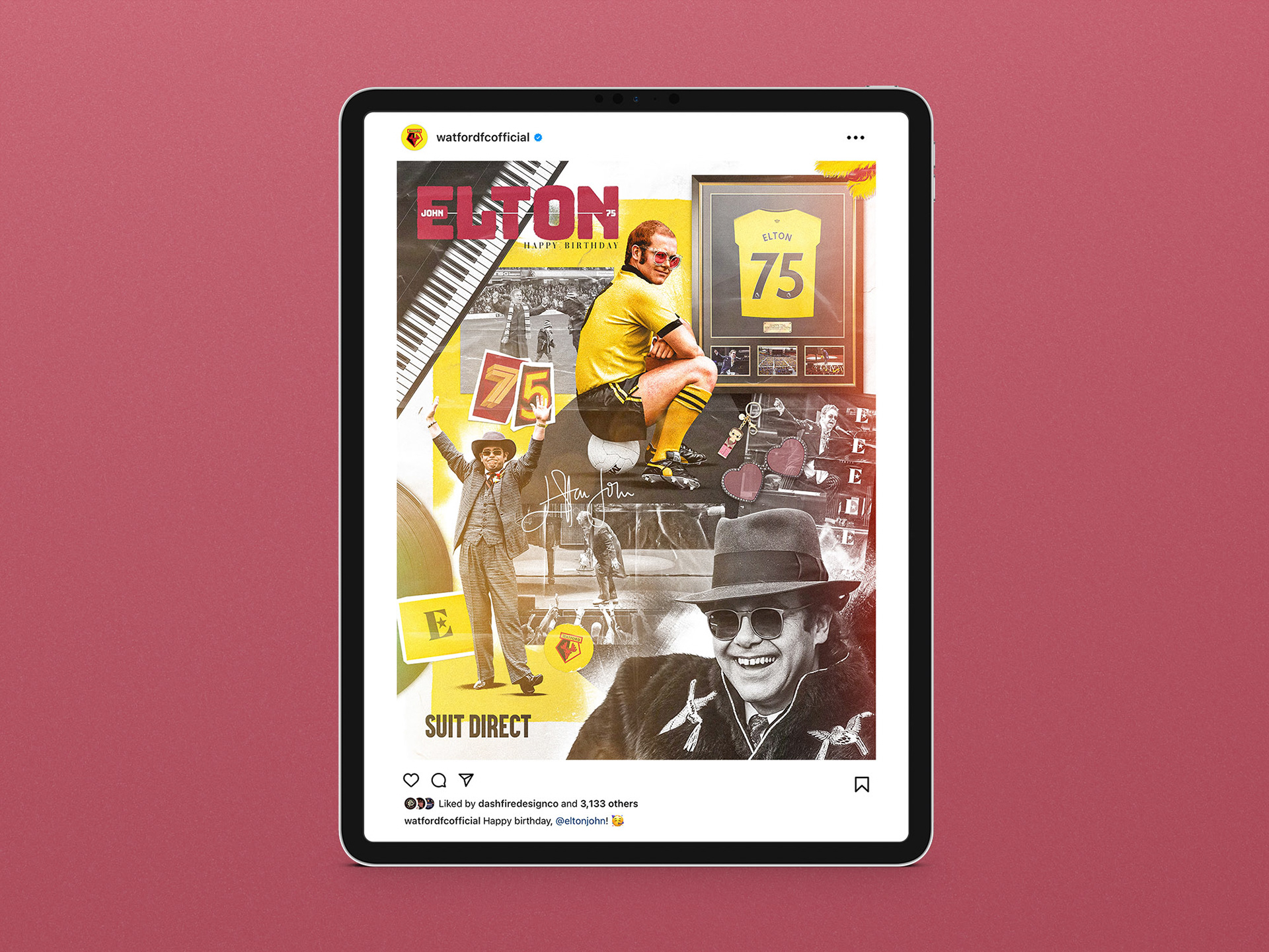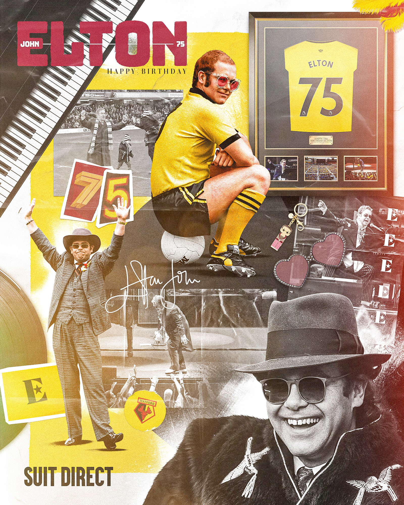 Social graphic celebrating the 75th birthday of former Watford Chairman, Elton John.
