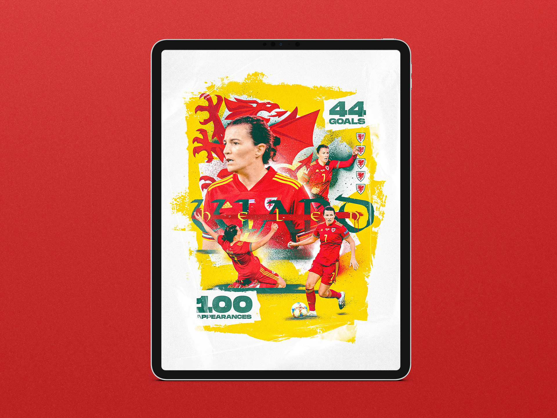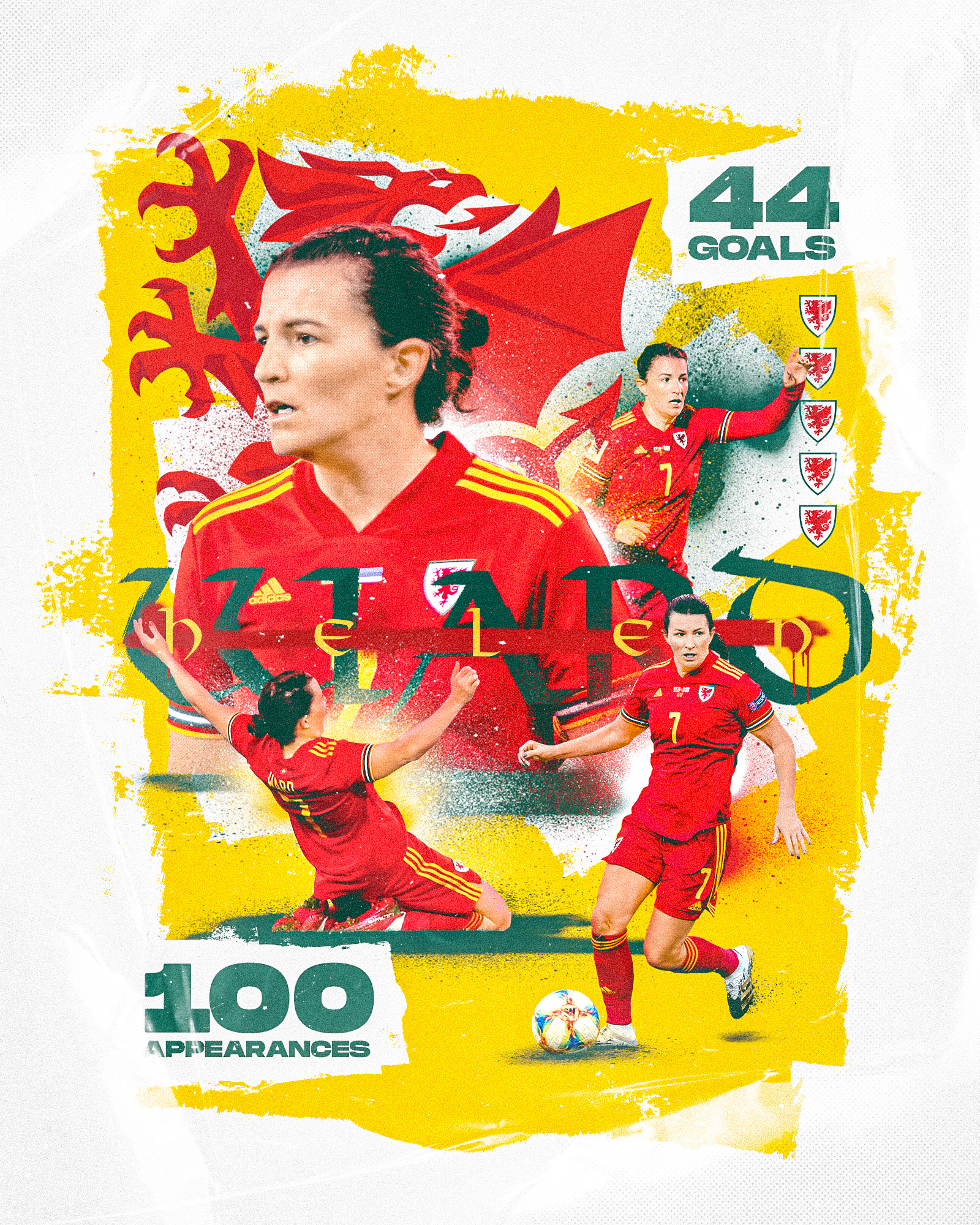 Social post and video frame celebrating Helen Ward's milestone appearance for Wales. She is their all-time leading goalscorer and only the fifth player to reach one hundred appearances.