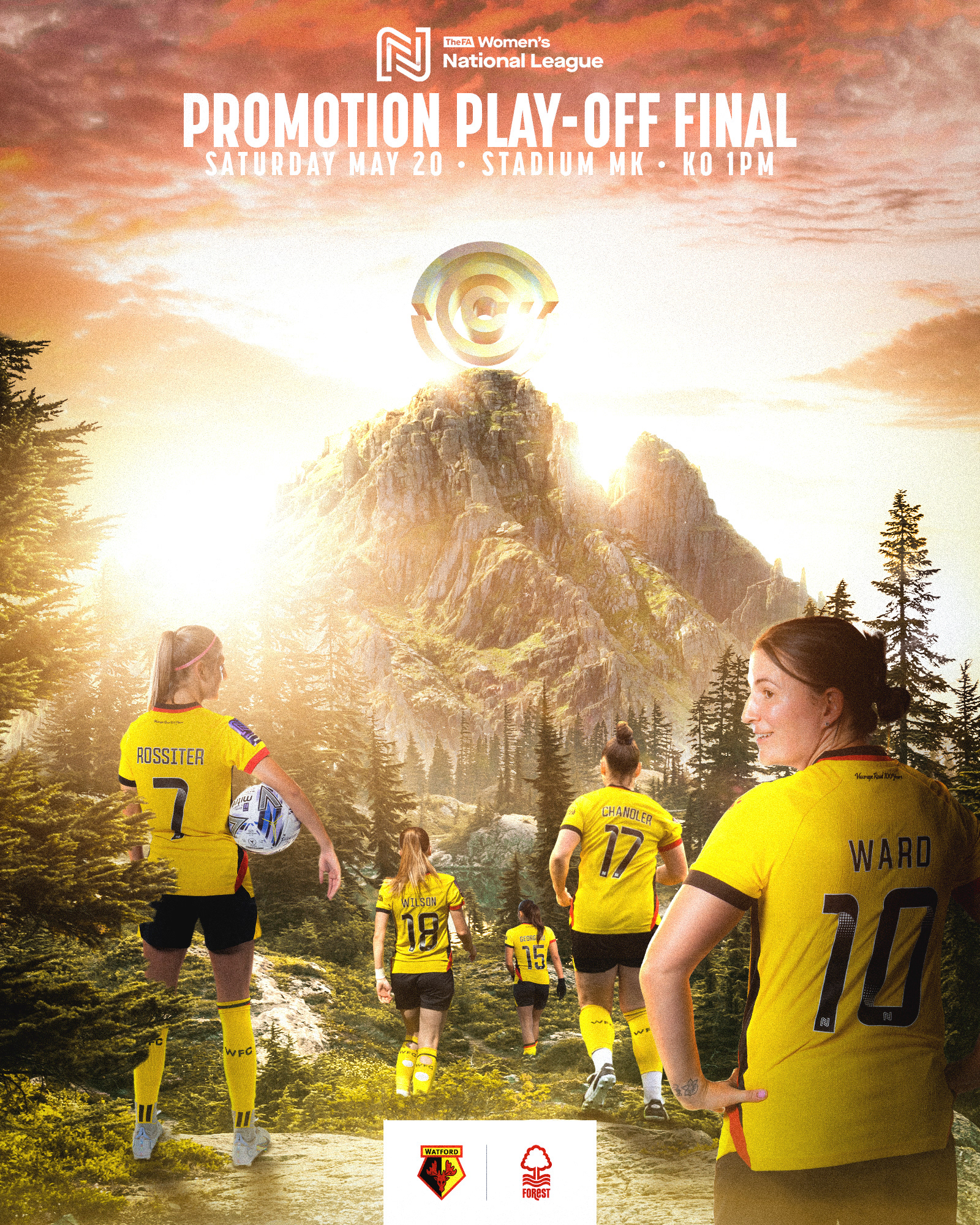 Hype graphic to generate interest in Watford FC Women's promotion play-off final against Nottingham Forest to gain promotion into the Barclays Women's Championship.